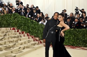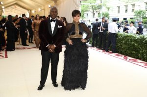 Cardi B in Moschino with Moschino designer Jeremy Scott in Moschino. She’s nearly eight months pregnant and I’m impressed she wanted to carry around that much fabric weight for the night. Between the two of them do you think there are any beads and pearls left on the planet? Jeremy must have seen Amal/Donatella and made sure Cardi had the required bedspread look too. It’s a lot of look but is it Catholic? I’m not so sure. Bridal? I’m also not so sure. Aliens who are biker/matadors? Nailed it.